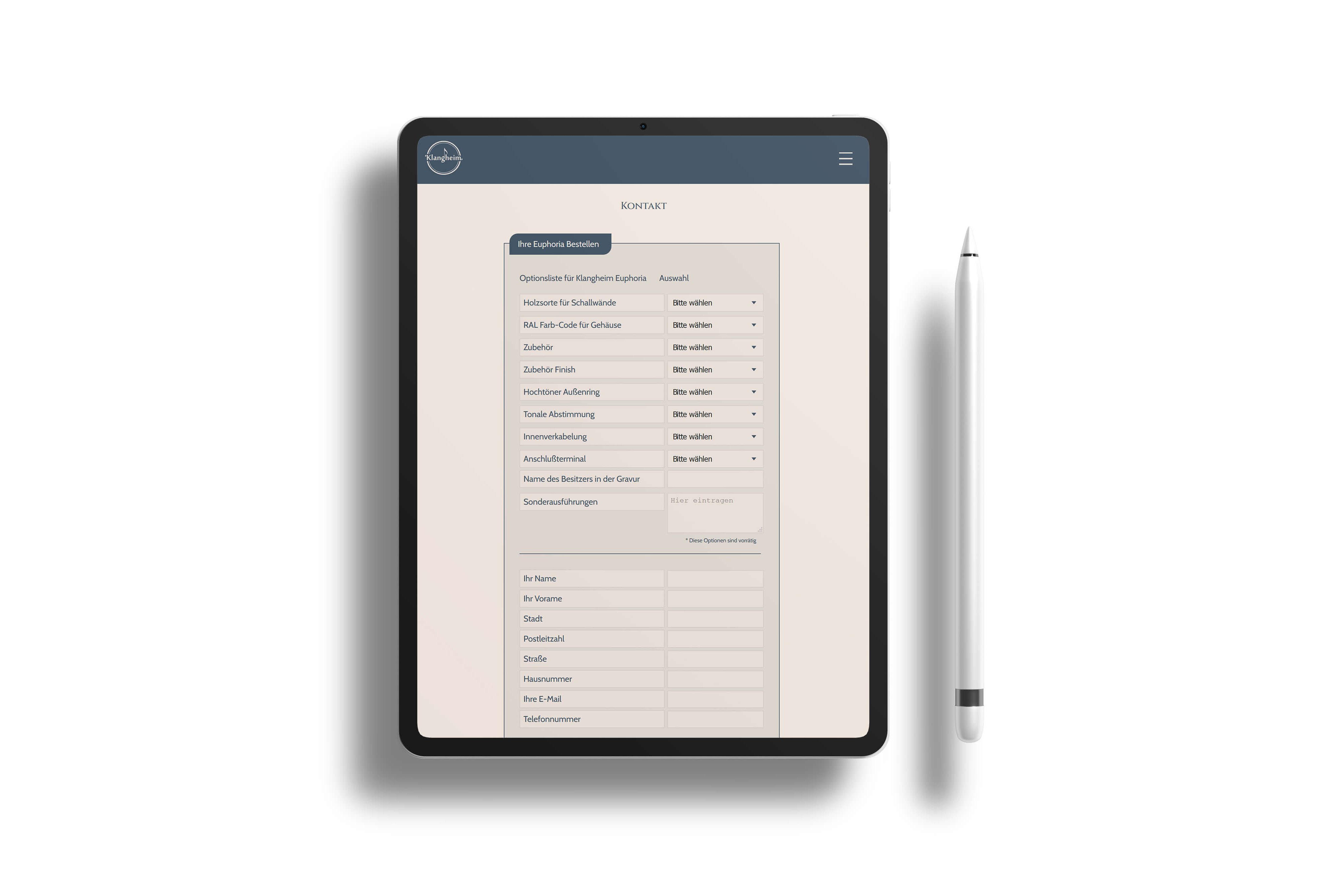 Der Firmeninhaber ist mit der bisherigen Webseite zufrieden, Hätte aber gerne für die Euphoria ein anderes Design, das unterstreichen soll wie edel und einzigartig diese Lautsprecher sind. Hauptziel ist es, auf Messen und im Kundengespräch das Produkt auf einem Tablet zu präsentieren und in einem Formular sofort die Designwünsche von Kunden festhalten zu können.