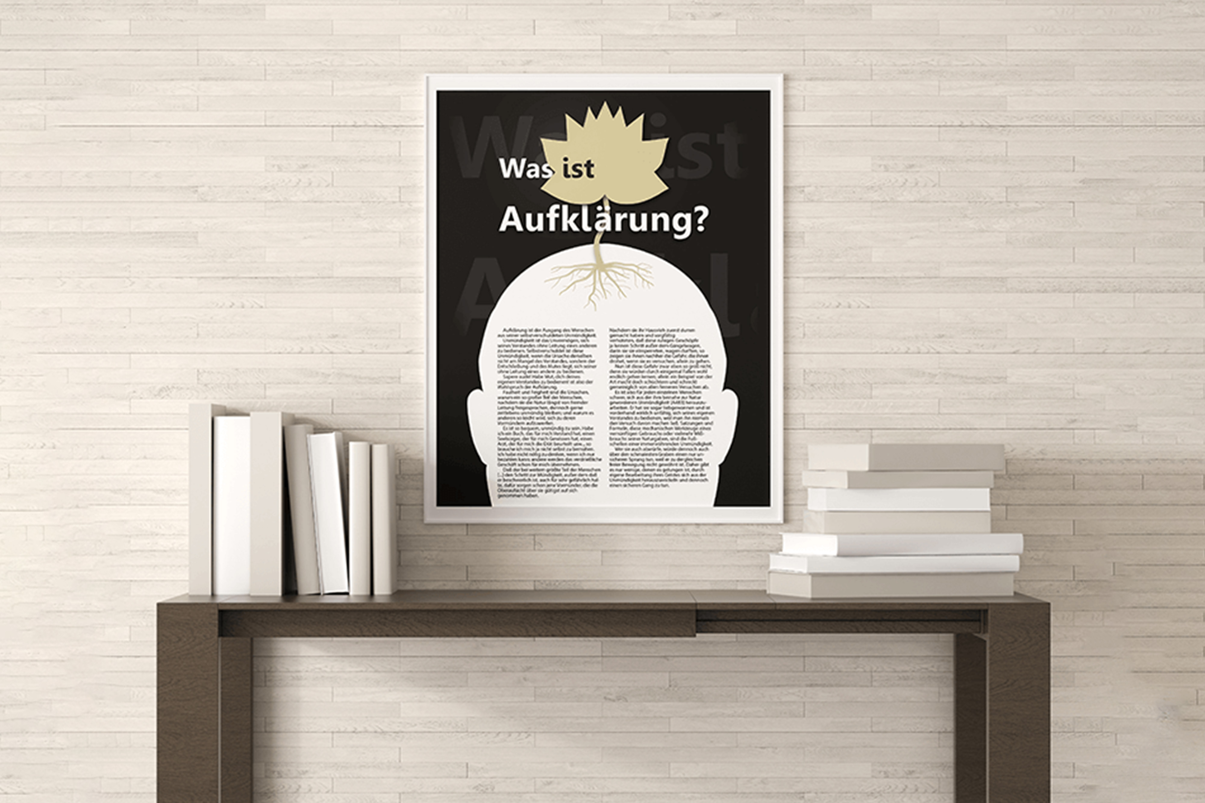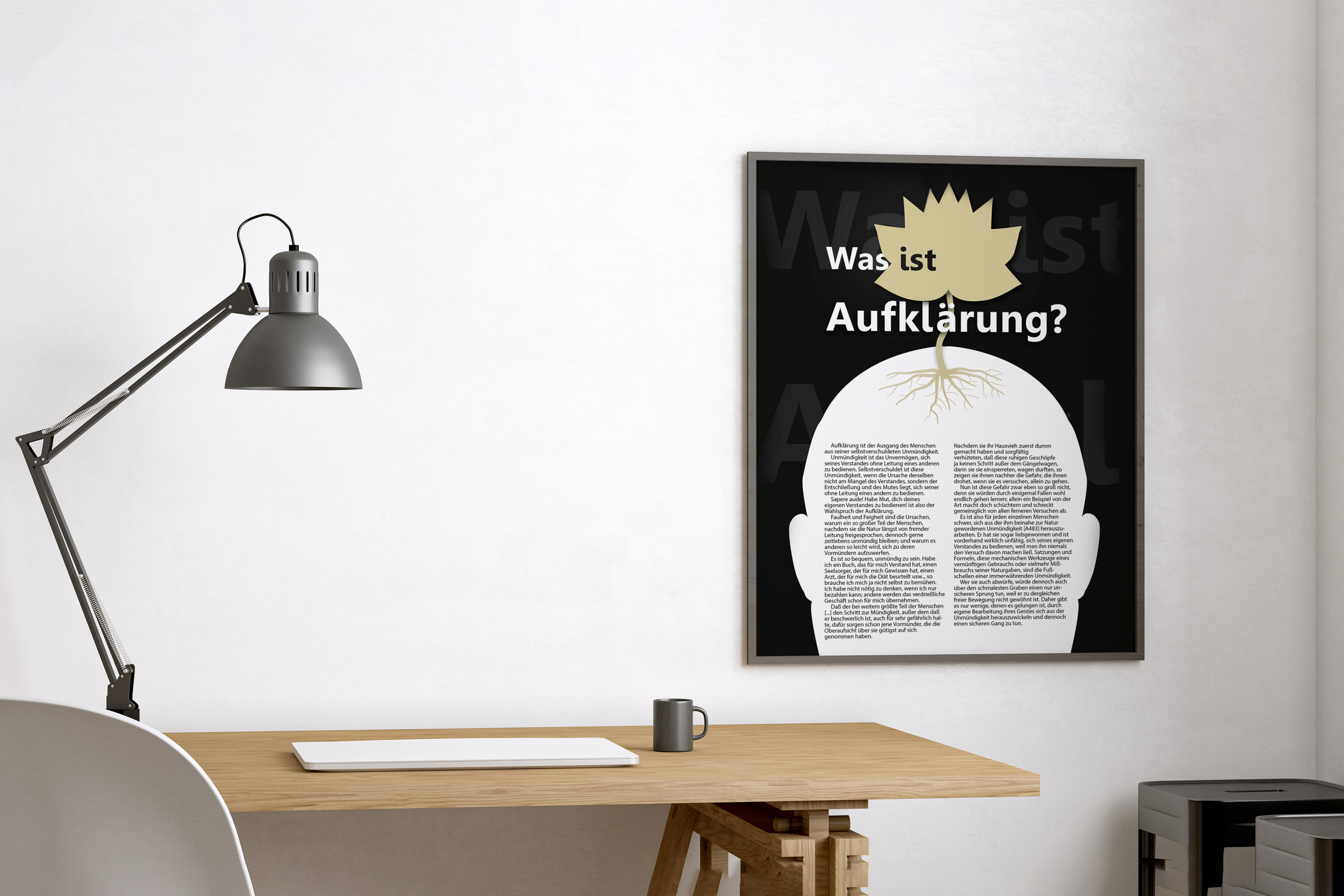 "Aufklärung ist der Ausgang des Menschen aus seiner selbstverschuldeten Unmündigkeit. Unmündigkeit ist das Unvermögen, sich seines Verstandes ohne Leitung eines anderen zu bedienen". Mit diesem Absatz versucht der Text des Plakats, den Leser in das philosophisch geprägte Thema "Aufklärung" einzuführen.