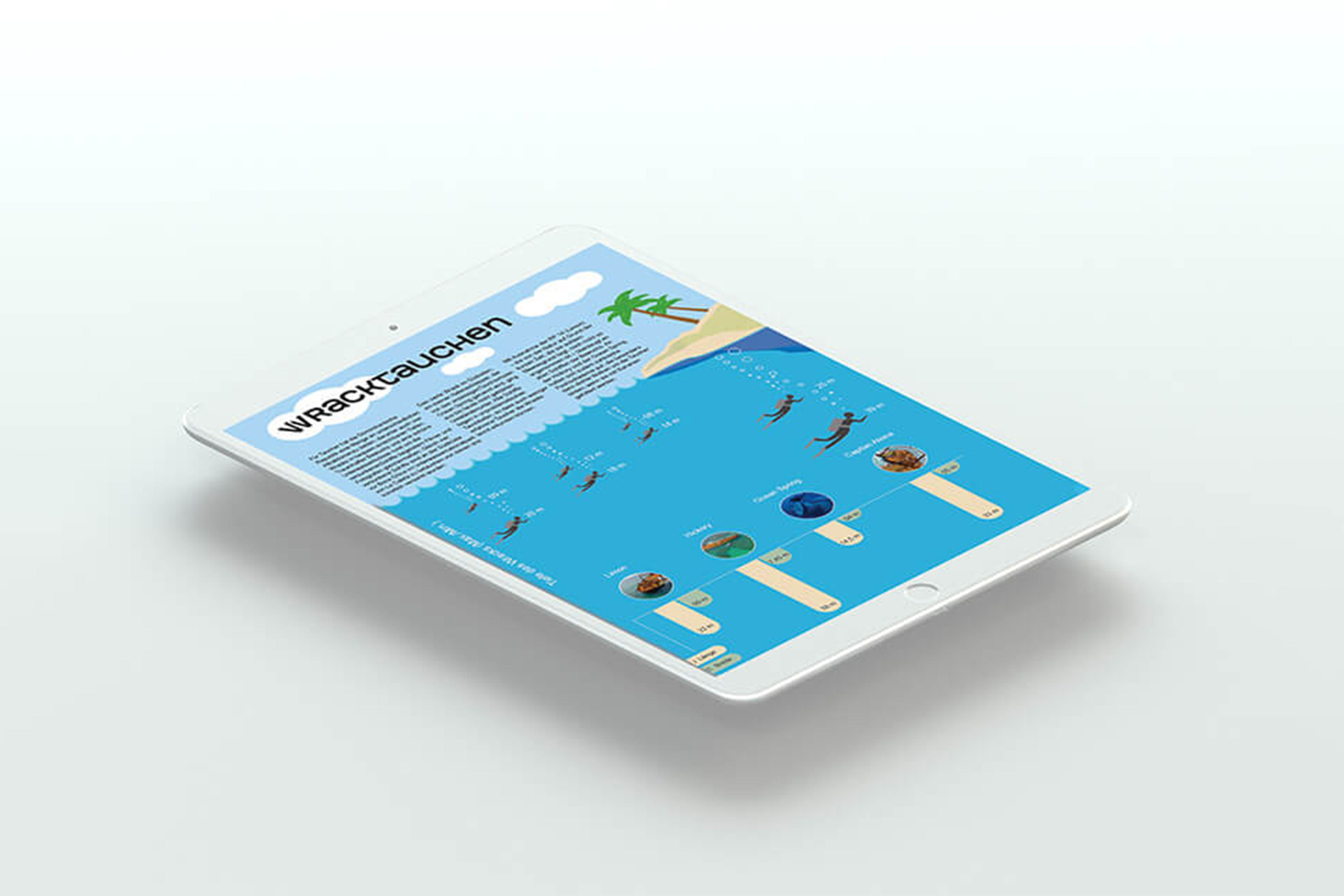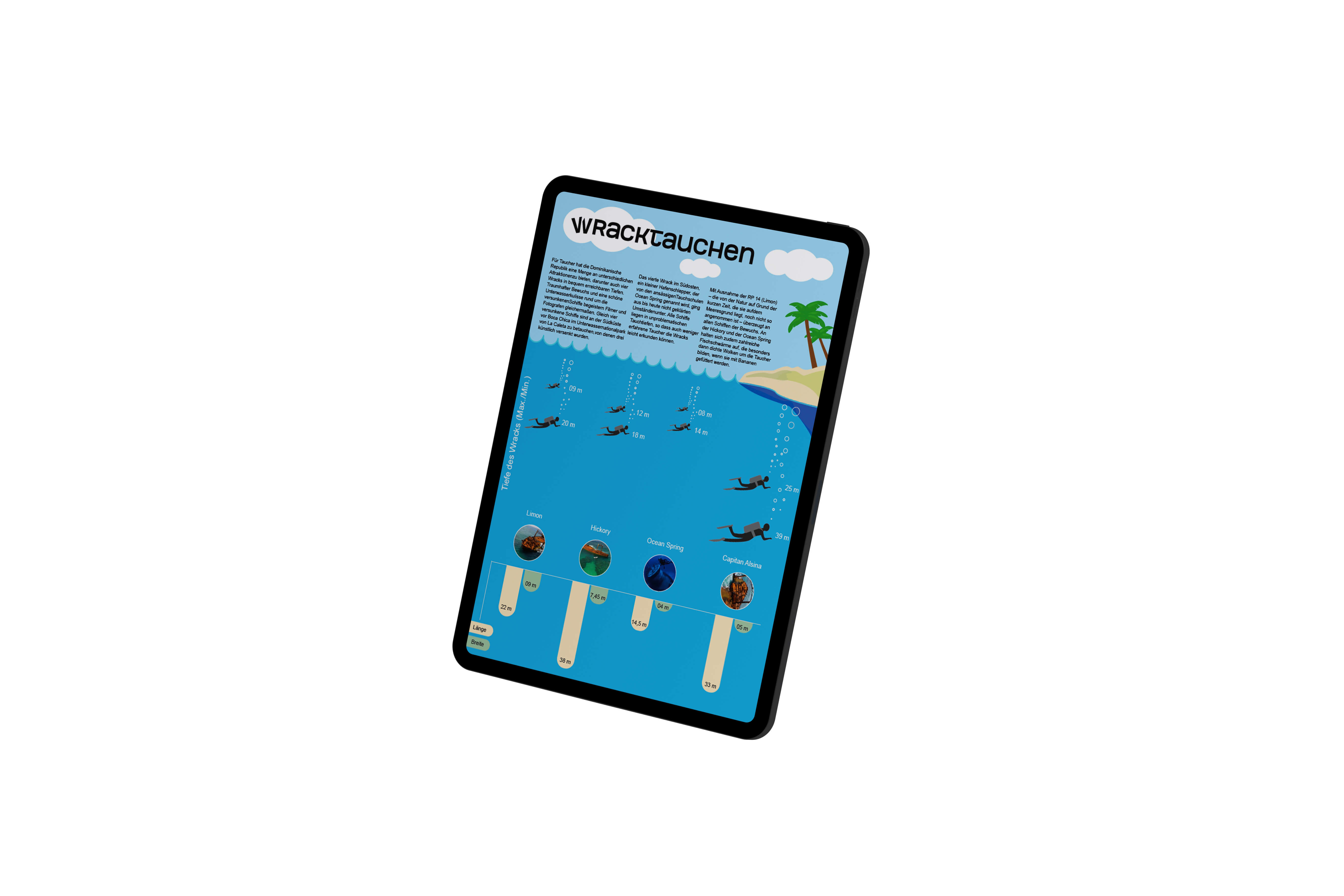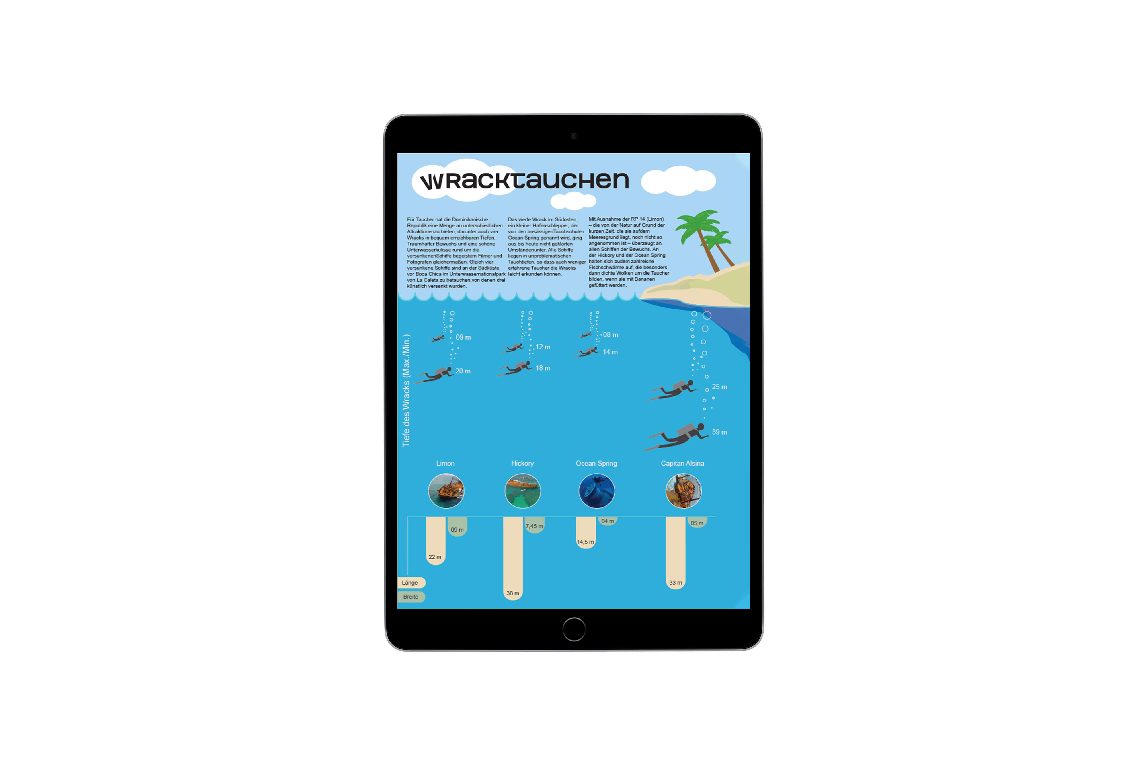 Inspiriert von dem traumhaften Karibikstaat und dem türkisfarbenen Meer entwickelte ich die Idee der Infografik. Zwei Taucher stellen für jedes Wrackziel die minimale- sowie die maximale Tiefe grafisch dar. Die Grafiken geben die Daten der Tiefe in getreuer Darstellung eines Balkendiagramms wider.